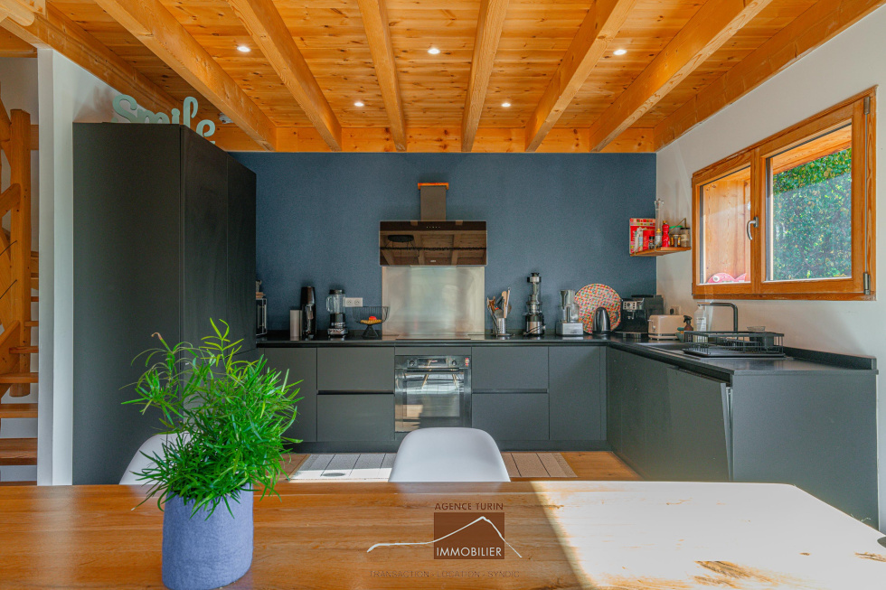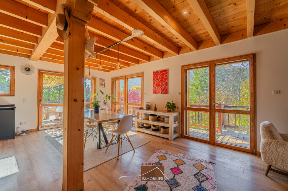 AU RDC : Entrée avec placards, WC séparés, belle pièce à vivre lumineuse donnant sur une terrasse avec vue sur les montagnes, accès jardin, poêle à bois, cuisine ouverte et équipée.